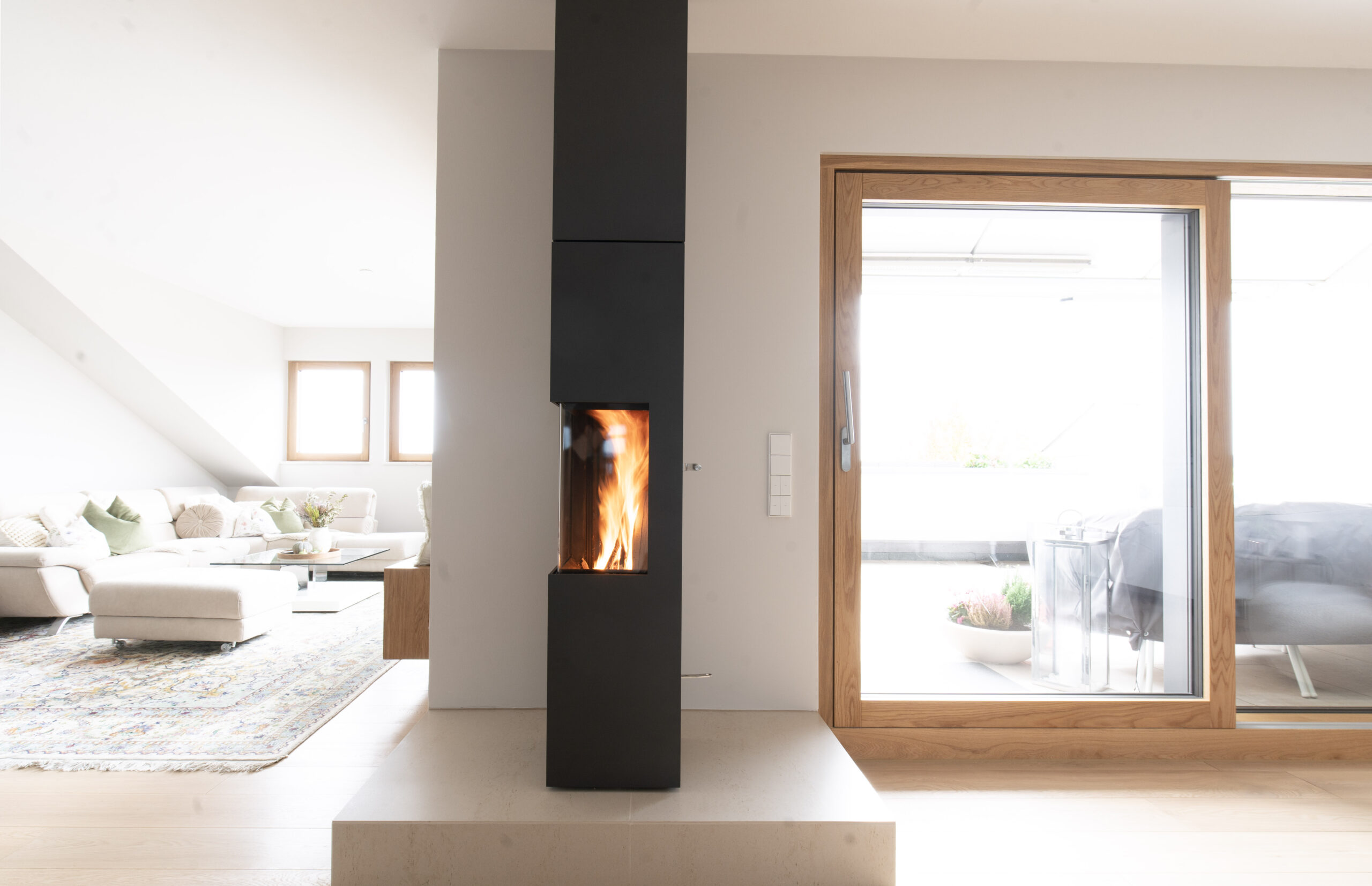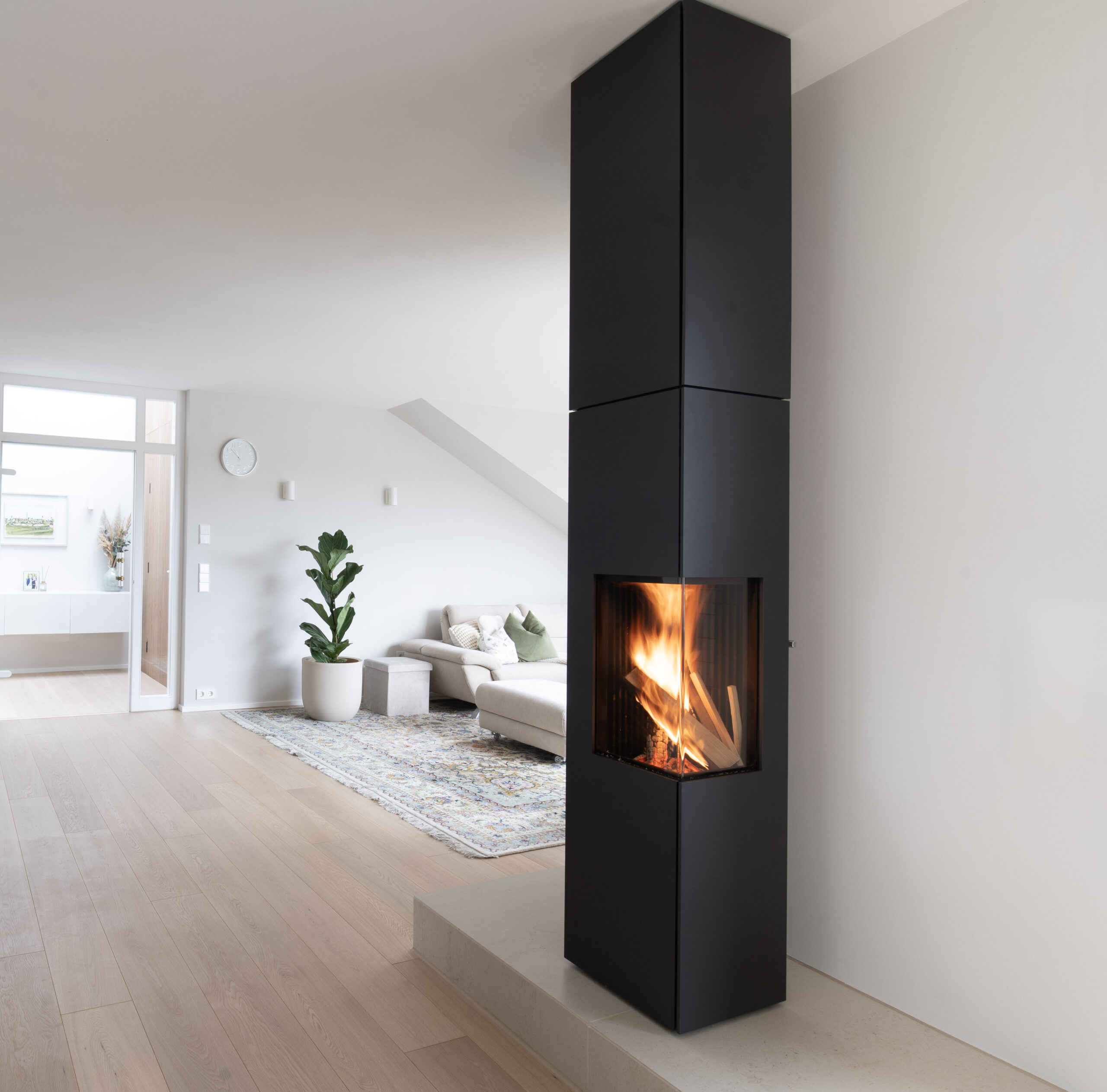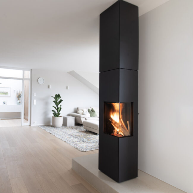 Feuer m Gegensatz zu herkömmlichen horizontalen Brennräumen, in denen das Feuer oft flach und begrenzt wirkt, brennt das Feuer im kiimoto in die Höhe und entfaltet so seine volle Pracht. Das besondere Feuer im vertikalen Brennraum verleiht Kamin kiimoto arton eine einzigartige Atmosphäre, die jeden Raum mit Wärme, Licht und Gemütlichkeit erfüllt. Das Gefühl tiefer Entspannung und Eleganz. indiv. Raumhöhe Im Gegensatz zu gewöhnlichen Kaminöfen erhebt sich dieser Kaminofen kraftvoll und elegant bis hinauf zur Decke – ein Ausdruck purer Ästhetik und vollendeter Perfektion. Obwohl das Feuer selbst in klassischer Größe lodert, schafft die imposante, vertikale Linienführung eine atemberaubende Präsenz im Raum. Erleben Sie, wie sich Wärme, Design und Exklusivität in Ihrem Zuhause vereinen. drehbar Durch seine drehbare Konstruktion können Sie das Feuer von jedem Punkt im Raum aus genießen. Mit seiner Fähigkeit, sich um 360 Grad zu drehen, schafft kiimoto ein eine gemütliche Atmosphäre in Ihrem Zuhause. So können Sie sich zurücklehnen und den Anblick und die Wärme des Feuers von überall aus genießen. New Layer effiziente Verbrennung hoher Wirkungsgrad handgefertigt in 88356 Bilder Feuerungstyp: Holzfeuerung Breite: 390 mm Höhe: 1490 mm Tiefe: 390 mm Nennwärmeleistung: 6 kW technische Daten